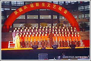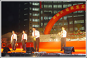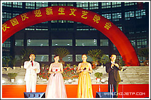 9月29日,经过半个多月的筹备,热烈庆祝中华人民共和国成立55周年暨迎接2004级新生文娱晚会在下沙新校区举行。学院中心广场上,墨绿色围裙、鲜红色地毯的舞台两旁摆放着各种花树,四只大彩球悬挂的红色标语浮在半空,旗杆上五星红旗和广场四周的彩旗迎风飘扬,这一切与高高耸立的图书馆交相辉映,洋溢着节日隆重的气氛。