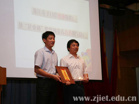 中午1∶30,颁奖典礼正式开始。浙江电子口岸有限公司总经理王卫东先生上台致辞。首先,王总对支持本次建博创业大赛的各高校表示感谢,并再次回顾了浙江电子口岸在习近平、吕祖善等省领导关怀下发展壮大的历程,介绍了“企业通——政府权威电子商务平台”的运作模式。最后,王总认为本次建博大赛免费服务企业,鼓励大学生创业成才的社会公益性主题明确,组织保障工作严密到位,奖金丰厚得奖面广,以及主办方的政府权威背景,因而受到了各大高校官方以及广大学生的热烈欢迎。同时,我院党委副书记潘素芳老师代表参赛高校也上台讲话。首先,她对本次大赛的圆满举行表示了诚挚的祝贺,对企业的大力支持也表示了衷心的感谢。接着,她还指出本次大赛开拓了校企合作的新模式,提高了学生的社会实践能力,为企业的信息化建设作出了积极的贡献,也提高了企业的知名度,是一次对企业和学校双赢的合作。
