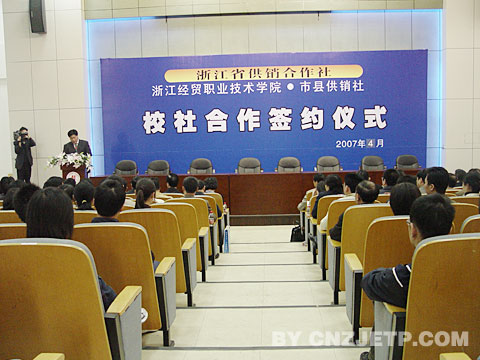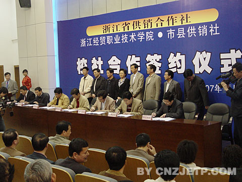 4月9日下午,学院和省供销社下属市县供销社在学院图书馆报告厅隆重举行校社合作签约仪式,省委教育工委副书记、省教育厅副厅长沈敏光、高教处处长方永平、副处长项小仙,《中国高等教育》杂志社总编陈浩,省供销社主任诸葛彩华,省供销社领导葛龙川、冯泉林、周加洪、瞿建、施祖法、何忠民,省社相关部门负责人,各市县社领导,学院党政领导、教师代表、学生代表等参加了仪式。仪式由省社监事会主任施祖法主持,学院院长李曙明、各市县社主任代表双方在合作协议书上签字。