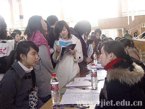 应聘学生十分珍惜这次供需见面的机会,早早来到招聘现场。各展位前人头攒动,场面十分热闹。用人单位对我院2008届毕业生的综合素质给予了良好的评价,杭州七方人力资源有限公司、浙江神力针织品有限公司、杭州富春江水电设备有限公司等诸多单位因为对前几年聘用的我院毕业生感到满意,这次又专程前来选聘的。同时,用人单位也对我院毕业生在专业技能、人文素养等方面提出了中肯的意见和建议。