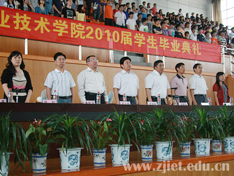 6月7日上午,艳阳高照,天气怡人,经贸校园和谐祥和,喜气洋洋,学院2010届学生毕业典礼在体育馆隆重举行。学院党政领导童学敏、李曙明、周文根、卢显林、潘新华、王建华、张红、蒋丽君在主席台就坐,各系部、处室负责人、全体辅导员、毕业班班主任和2010届毕业生参加了毕业典礼。大会由院长助理蒋丽君教授主持。