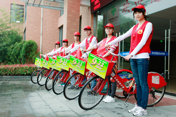 为了号召更多的车友加入,志愿者小陈在超市门口高高举起公共自行车,“喜欢骑单车,可以锻炼身体,还可以节能减排,保护环境。热爱骑车的市民,一起来吧!”