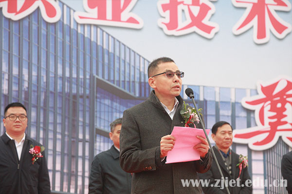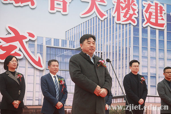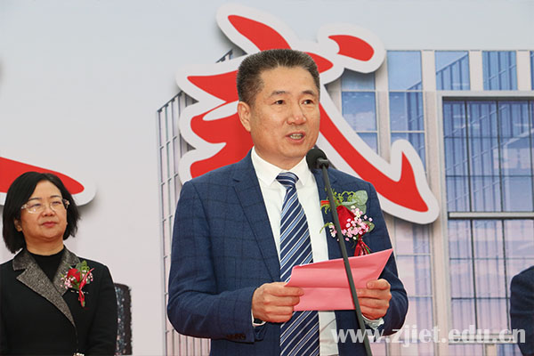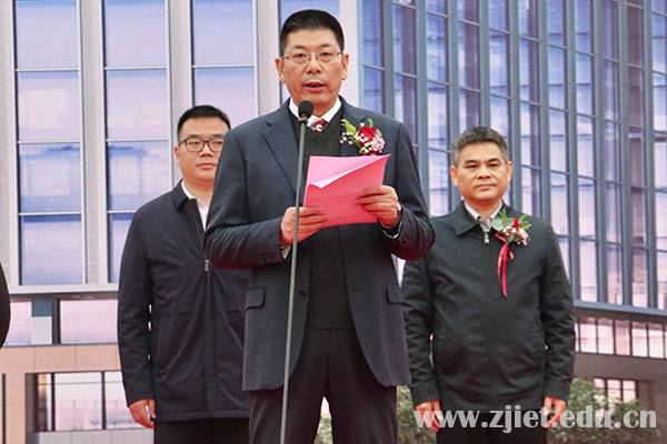校党委书记劳赐铭致辞。他代表学校向各位领导和来宾致以最热烈的欢迎,向为产教融合大楼工程顺利推进做出努力的全体人员致以最诚挚的谢意。他表示,产教融合大楼的建设,是学校进一步贯彻落实党的十九大精神和全国教育大会精神的重要举措,是学校站在新的发展起点、谋求新一轮高水平高质量发展的重要载体,是学校加快推进国家优质校和“双高”校建设的重要抓手。大楼建成后,将进一步改善学校办学条件和对外形象,提升办学水平和综合实力,从而为搭建“产学研创”于一体的产教融合综合示范点,集聚资源,打下坚实基础,有力促进学校可持续发展。他要求各参建单位认真履行职责,把大楼建设成为学校深化教学改革、支撑高素质高水平人才培养的标志性“优质工程”,并希望全体师生员工以此为契机,进一步凝心聚力,奋发有为,以永不懈怠的精神状态和一往无前的奋斗姿态,推动学校新一轮更高质量、更高水平发展。