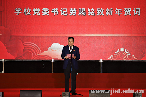 晚会伊始,学校党委书记劳赐铭致新年贺辞。他首先代表学校向全体师生员工送上新年祝福。劳赐铭回顾了学校2020年取得的成绩和进步。这一年学校加强疫情防控,切实保障师生安全;探索融入式党建路径,加强党的全面领导;坚持内涵式发展道路,综合办学水平再上新台阶;坚持桥梁式育人载体,人才培养质量进一步提高;坚持共享式校园文化,师生获得感持续增强;持续推进“清廉经贸”建设,严格落实政治监督。他表示,2021年是中国共产党成立100周年,是迈向第二个百年奋斗目标的起步之年,也是学校实施“十四五”规划的开局之年。他号召大家要在百舸争流中勇立潮头,在群山竞秀中勇攀高峰,朝着学校第三次党代会提出的建设高水平职业大学的目标努力奋斗,为助力“重要窗口”建设和争创社会主义现代化先行省增光添彩,争取以优异成绩,向建党百年献礼!