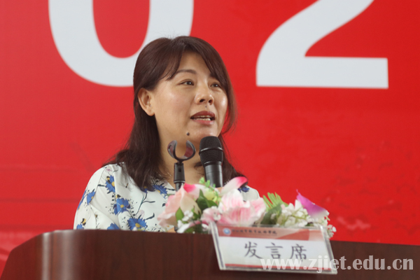 2021届毕业生代表、2020年浙江省高职高专院校国家奖学金特别评审奖获得者金心雨发言。她分享了在学校目标导航工程的引领下,踏实向学、成功创业并努力成为一名中华优秀传统文化推动者的成长故事,并号召全体毕业生坚定信仰,保持“一直在路上”的执着精神。