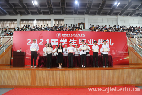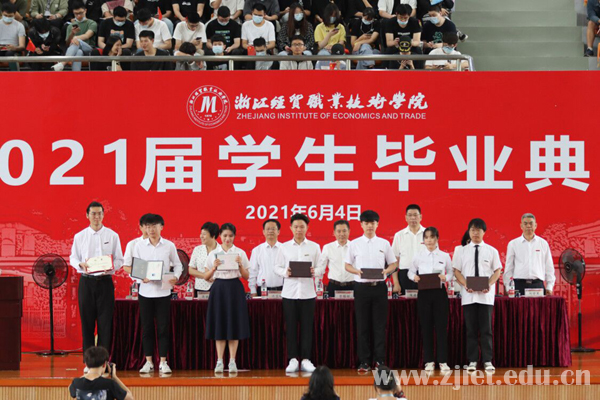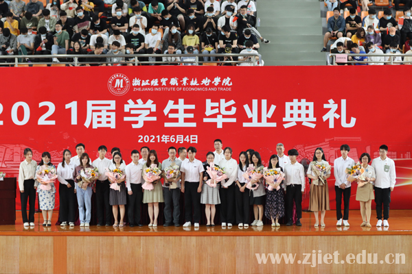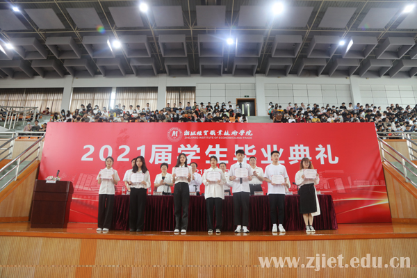 学校副校长蒋丽君宣读《关于表彰2021届优秀毕业生的决定》和《关于表彰2021届毕业生奖学金的决定》。学校领导为浙江省优秀毕业生代表、学校优秀毕业生代表、学校毕业生奖学金获奖代表颁发荣誉证书,并为毕业生代表颁发毕业证书、赠送校友卡和《毕业生廉洁从业教育手册》,勉励全体毕业生做清廉的经贸青年,坚实迈好人生每一步!
