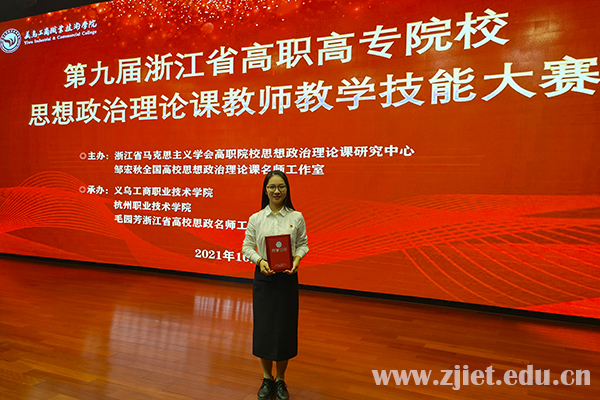 10月29日,第九届浙江省高职高专院校思想政治理论课教师教学技能大赛在义乌工商职业技术学院顺利举行。我校马克思主义学院叶紫老师荣获一等奖。本次大赛由浙江省马克思主义学会高职分会思想政治理论课建设研究中心、邹宏秋全国高校思想政治理论课名师工作室主办,义乌工商职业技术学院、杭州职业技术学院、毛园芳名师工作室承办。来自全省34所高职院校选送的34名优秀的思政课教师参加比赛,覆盖范围为历届最广。