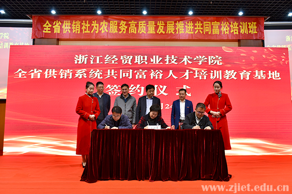 会上,蒋丽君介绍了学校服务系统、乡村振兴、共同富裕人才培训工作情况,全省供销系统共同富裕人才培训教育基地建设方案,以及学校举办全省供销系统暨山区26县优质农产品展销会的情况。衢州市供销社副主任顾劲立、淳安县供销社党委副书记、副主任陆红伟代表市、县二级供销社与学校签订了《共建共同富裕人才培训教育基地协议》。