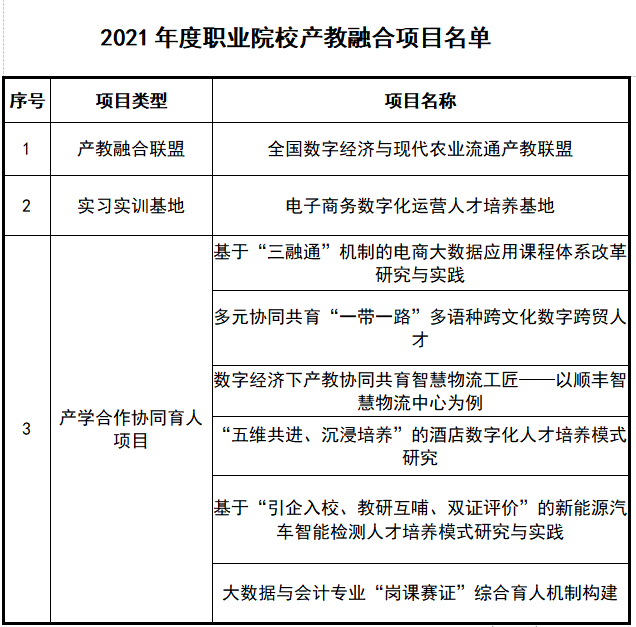 其中,全国数字经济与现代农业流通产教联盟被立项为2021年度职业院校产教融合联盟;电子商务数字化运营人才培养基地被立项为2021年度职业院校实习实训基地;“基于‘三融通’机制的电商大数据应用课程体系改革研究与实践”“多元协同共育‘一带一路’多语种跨文化数字跨贸人才”等6个项目被立项为2021年度浙江省职业院校产学合作协同育人项目。据悉,此次全省共有15个产教融合联盟、20个产教融合实践基地、101个实习实训基地和248个产学合作协同育人项目获得立项。