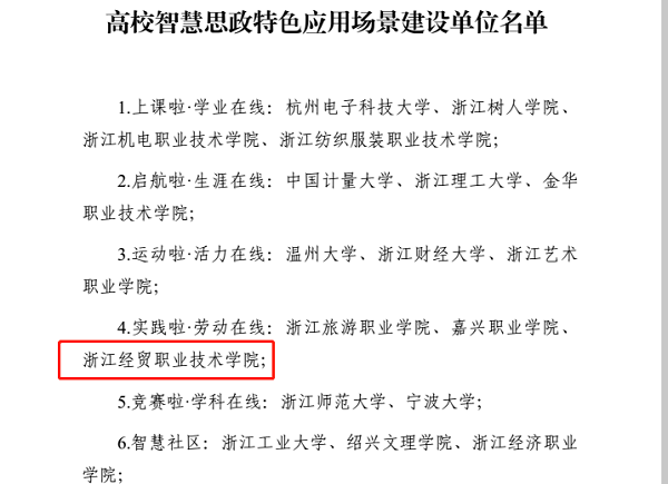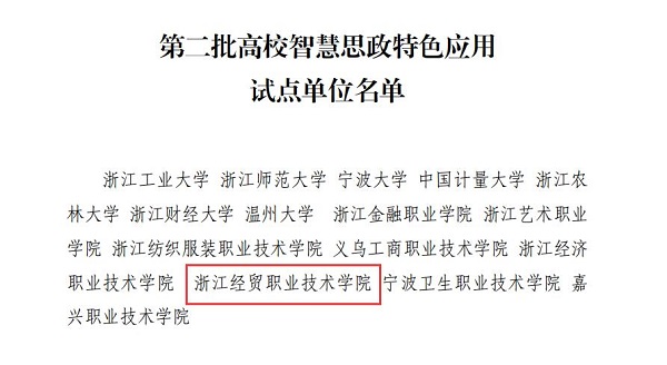 近日,浙江省教育厅办公室公布了第二批高校智慧思政特色应用试点单位,我校《基于学生全生命周期的智慧思政体系建设》 入选高校智慧思政特色试点单位,同时被列为“实践啦·劳动在线”应用场景建设单位。据了解,此次共有浙江工业大学、浙江师范大学、中国计量大学等15所高校成为试点单位。