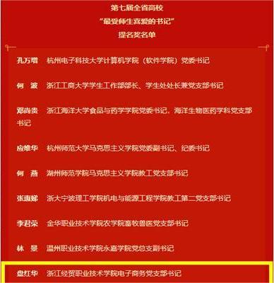 为深入学习贯彻习近平总书记重要讲话精神,全面实施“红色根脉强基工程”,充分发挥先进典型的示范引领作用,选树一批模范传承红色基因、践行初心使命的高校基层党组织书记,经省委教育工委同意,省普通高校党建研究专业委员会、浙江教育报刊总社组织开展了第七届全省高校“最受师生喜爱的书记”选树宣传活动。