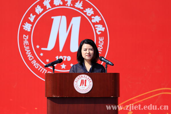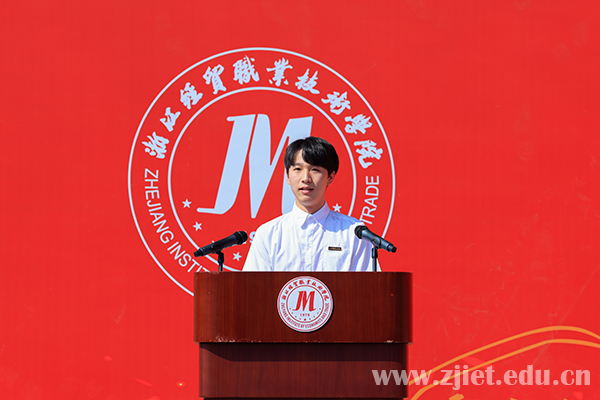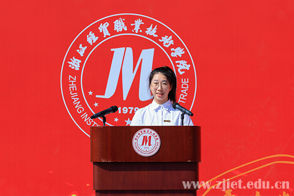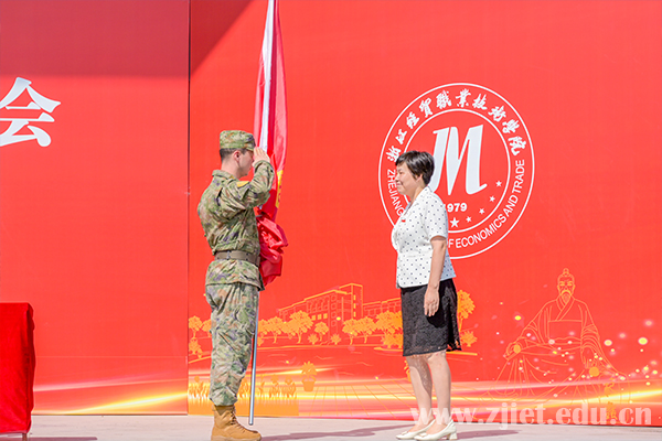 大会上,主席台领导为新生代表佩戴校徽,对新生正式成为“经贸人”表示祝贺。副校长蒋丽君为军训团授旗。新生代表、国际贸易学院年琛,老生代表、财务会计学院王科建,教师代表、工商管理学院沈红艳,军训教官代表、94973部队马理想,94973部队管理科科长梁孝挺分别发言。
