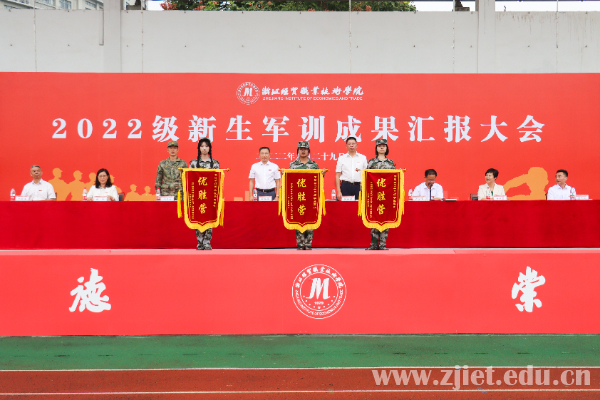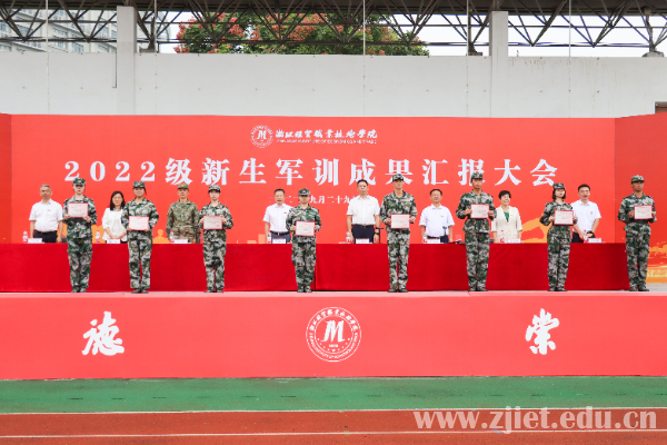94973部队管理科科长梁孝挺宣读《关于表彰2022级学生军训先进集体和先进个人的决定》后,与会领导为受表彰的先进集体和优秀个人代表颁奖。