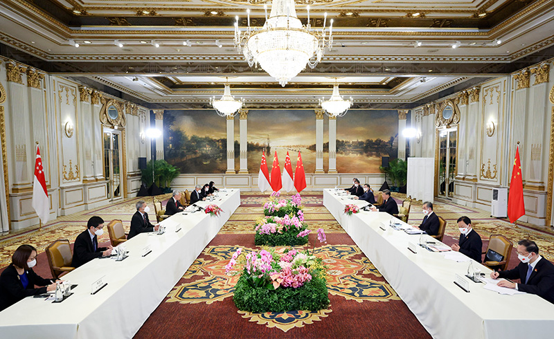 习近平指出,面对世纪疫情和百年变局,中新关系发展势头良好,不仅助力两国抗疫和经济复苏,而且为地区稳定和繁荣注入了正能量。中新关系具有前瞻性、战略性和示范性。中共二十大对中国全面建设社会主义现代化国家、全面推进中国式现代化作出了战略部署。中方愿同新方携手推动两国与时俱进的全方位合作伙伴关系不断取得新进展。