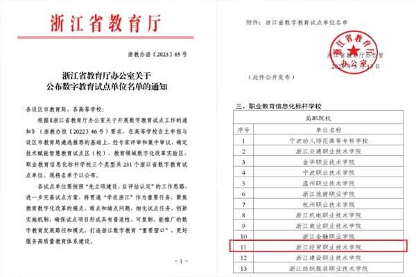 近日,浙江省教育厅办公室发布了《关于公布数字教育试点单位名单的通知》(浙教办函〔2023〕65号),我校成功入选“浙江省数字教育试点单位”暨“浙江省职业教育信息化标杆学校试点单位”。据悉,此次共评选出100所职业教育信息化标杆学校试点单位,其中高职院校29所,中职学校71所。