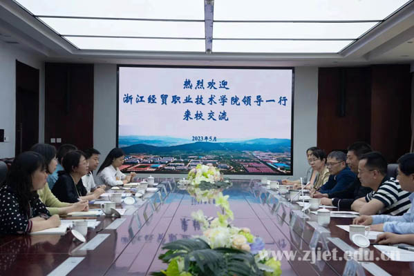 5月12日下午,调研组一行来到山东商业职业技术学院。山东商业职业技术学院党委副书记、院长王鑫热情接待了调研组,详细介绍了学校的办学特色,以及在“以群建院”逻辑设想、教学督导双向促进、大科研转化提升等方面做出的改革举措。王鑫表示,以群建院是高职院校适应数字化转型趋势,走内涵式发展道路的必然需求。两所学校都属于财经商贸类高职院校,在专业群布局、人才培养、校企合作、科研绩效管理等方面有很多共通之处,值得相互学习借鉴。陈德泉感谢山东商业职业技术学院毫无保留的经验分享。他表示,山东商业职业技术学院是全国头部高职院校,有很多优秀的经验值得我们学习和借鉴。希望山东商业职院能够一如既往的给予浙江经贸学院帮助和支持,双方进一步加强互动交流,开展全方位的沟通合作,助力学校职业教育水平再上新高度。与会双方就专业动态调整、专业群建设、人事管理、绩效考核、科技创新等方面展开深入探讨。调研组还参观了产业会客厅、科研大楼、文化创意产业学院实训中心、商文化研学中心等。