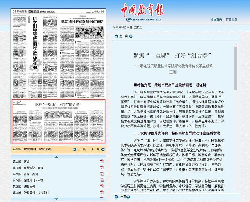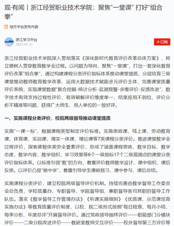 通过数字赋能,课堂教学评价由可量化走向可视化、由大众化走向精准化,评价主体由单一化走向多元化、由扁平化走向立体化。“十三五”以来,学校累计培育优质课程129门、示范课程10余门,孵化国家、省级精品在线课程14门。学校入选浙江省课堂教学创新校,推动建设国家“双高”专业群1个、省级“双高”专业群2个,获得省级教学成果奖4项。近两年,教师获省级教学能力比赛三等奖以上奖项16项,学生获得省级及以上各类技能竞赛奖项人数990人。学校“培育人人奋斗精神 创造人人出彩机会”案例入选浙江省教育评价改革典型案例。