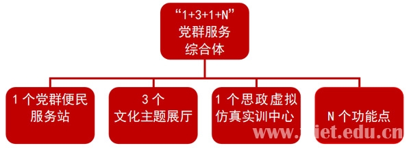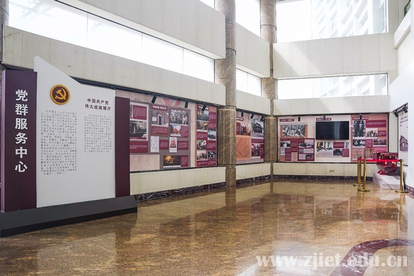 学校党群服务中心位于图书馆二层,总面积2000平米,以“理论知识的学习园地、青年党员的教育基地、学生党建的活动阵地、先锋骨干的培训基地、文化熏陶的精神家园”为理念,以“三建三优”(建阵地、建组织、建机制,优活动、优服务、优载体)为总体思路,集党性政治教育、红色文化浸润、虚拟思政教学、便民事项办理等多功能于一体,着力打造的由1个党群便民服务站、3个文化主题展厅、1个思政虚拟仿真实训中心和N个功能点组成的“1+3+1+N” 党群服务综合体。