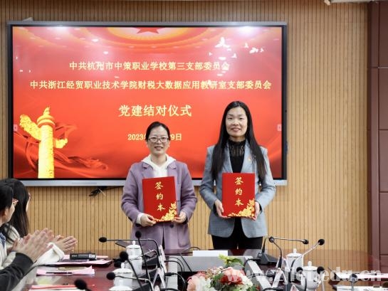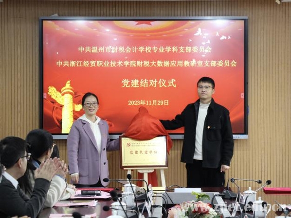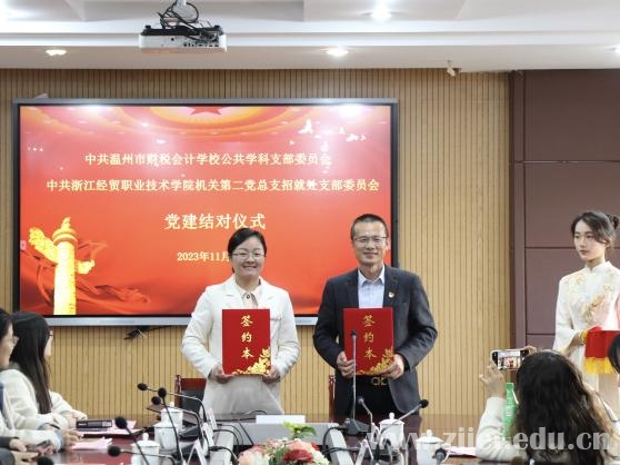 会议第一阶段,学校机关第二党总支招生就业处党支部与温州市财税会计学校公共学科党支部,财务会计学院财税大数据应用教研室党支部与温州市财税会计学校专业学科党支部、杭州市中策职业学校第三党支部进行了党建结对。