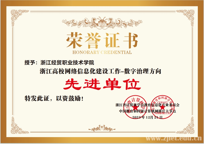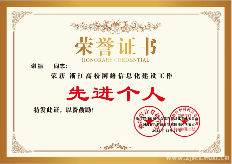 2023年12月,经浙江省计算机学会教育信息化专业委员会、中国教育和科研计算机网浙江省主节点联合评审,我校荣获2023年浙江高校网络信息化建设先进单位(数字治理方向),图书信息中心谢振同志被评为浙江高校网络信息化建设先进个人。