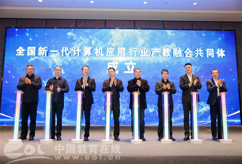 启动仪式上,来自指导单位和牵头单位的8位代表同时按下按钮,标志着全国新一代计算机应用行业产教融合共同体正式成立。