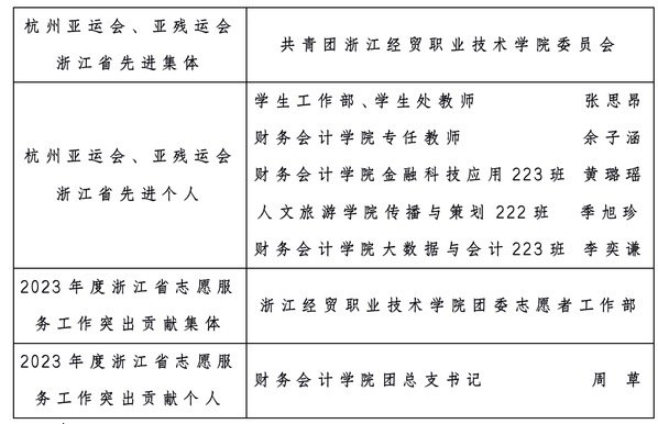 杭州亚运会、亚残运会已经结束,在省委、省政府、共青团浙江省委等部门开展的总结表彰中,我校共获八项荣誉,成果丰硕!