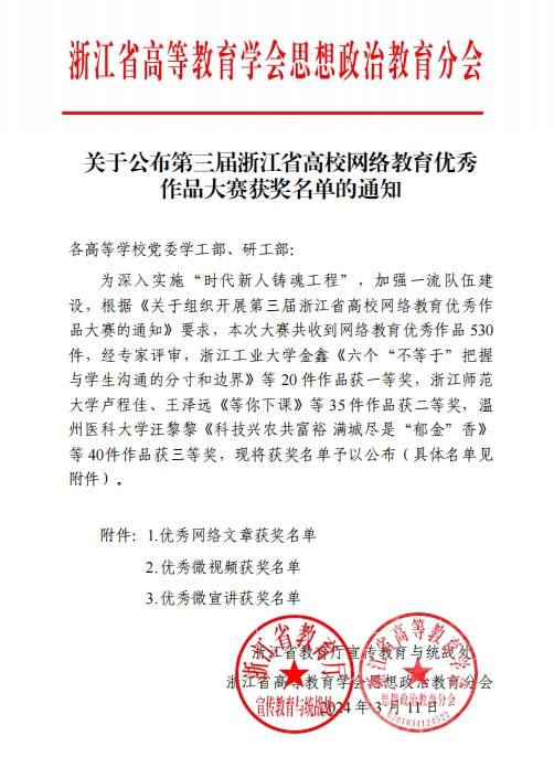 为深入学习党的二十大精神,全面贯彻习近平新时代中国特色社会主义思想,实施“时代新人铸魂工程”,进一步落实《关于推进浙江省高校一流辅导员队伍建设的实施意见》,浙江省教育厅宣传教育处、浙江省高等教育学会思想政治教育研究分会组织开展了第三届浙江省高校网络教育优秀作品大赛,我校辅导员在大赛中获奖。