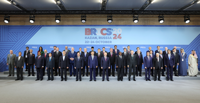 当地时间10月24日上午,国家主席习近平在喀山会展中心出席“金砖+”领导人对话会并发表题为《汇聚“全球南方”磅礴力量 共同推动构建人类命运共同体》的重要讲话。这是出席对话会的金砖国家及嘉宾国领导人或代表、国际组织负责人集体合影。新华社记者 姚大伟 摄