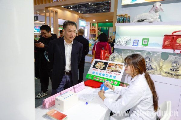 在展位上,劳赐铭与徐晓勇亲切交谈,询问了解他在创业过程中遇到的困难和问题,并表示学校将继续为校友们提供全方位的支持和帮助。他指出,学校一直致力于培养具有创新精神和实践能力的高素质人才,希望校友们能够继续发挥自身优势,为农业领域的发展做出更大的贡献。徐晓勇表示,非常感谢母校对自己创业的高度支持和重视,所学的食品营养与检测专业底子,使自己在学习养殖技术的过程中融会贯通。与学校建立的长期的产学研用合作关系,帮助自己持续研究羊肉品质提升、膻味降低、养殖条件优化等,形成了从理论研究到实际应用的完整链条。