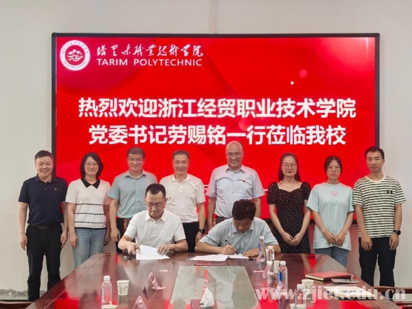在塔里木职业技术学院,劳赐铭对塔职院近年来超常规发展取得的成绩表示高度赞赏。劳赐铭指出,学校与塔职院有着良好的合作基础和兄弟般的情谊,自双方开展对口帮扶工作以来,各领域都取得了良好成效,此次签订相关合作协议,既是深入贯彻落实第三次中央新疆工作座谈会和第九次全国对口支援新疆工作会议精神,也是落实“浙阿职业教育发展联盟”单位建设内容的具体举措,必将会推动两校办学质量和办学水平进一步提升。塔里木职业技术学院党委书记王志朝介绍了塔职院发展尤其是新校区的建设情况,并对学校在专业建设、人才培养、继续教育等方面给予塔职院的大力支持表示感谢,希望学校一如既往支持塔职院的发展建设。