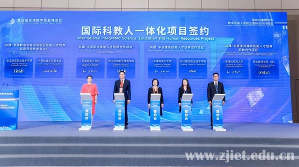 9月28日下午,在第四届全球数字贸易博览会期间举办的“数字贸易人才校企国际合作对接会”在杭州举办。来自浙江省商务厅、浙江省教育厅、浙江省人力资源和社会保障厅相关的政府领导、国际组织负责人、境外政商代表、国内外高校专家、数字贸易领军企业家及行业协会代表400余人参会。学校校长陈德泉受邀参会,教务处、商务智能学院、数字贸易学院、国际交流与合作中心等相关部门负责人及教师代表参加会议。